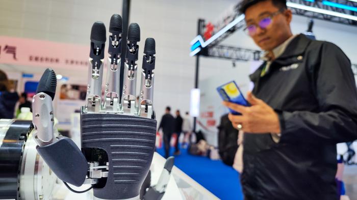 3月18日,天津,观众参观灵巧手机器人设备。中新社记者 佟郁 摄