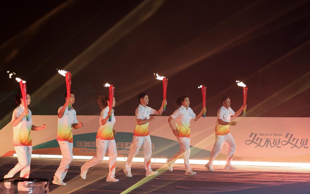 舞台远端,六名火炬手——乒乓球大满贯得主丁宁、跳水奥运冠军田亮、女篮亚运冠军王丽丽、攀岩世锦赛冠军龙见国、帆船运动员卓月桃和帆板教练员陈哲,高擎火炬奔跑而来。
