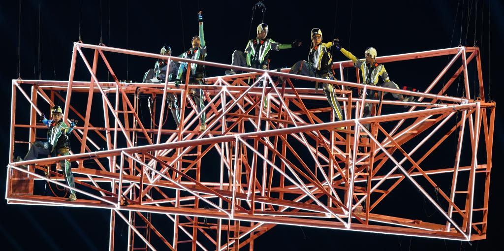 音乐重新变得动感十足,“亚亚”变身自贸港建设者再次登场。8组空中威亚装置通过矩阵组合,变换成大型吊臂、拱形桥梁与深海钻井平台,寓意拔地而起的“梦想巅峰”。逐梦者在巨大的钢架道具上奋力攀登、彼此托举,象征着自贸港建设者攻坚克难的历程。