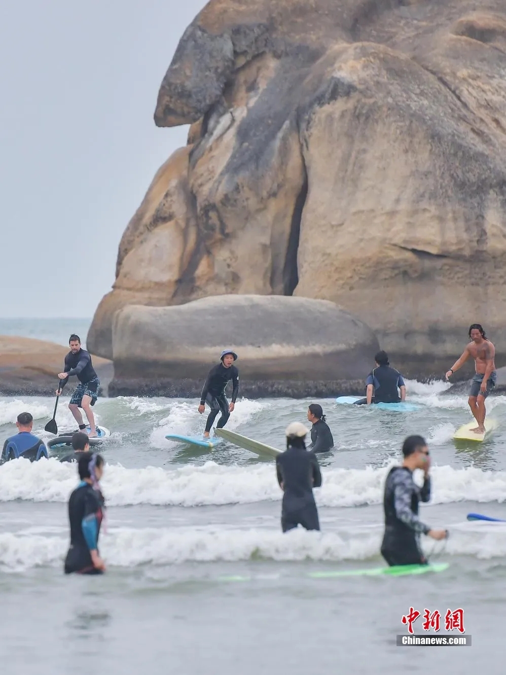 三亚市后海吸引众多游客前来体验冲浪。骆云飞 摄(资料图)