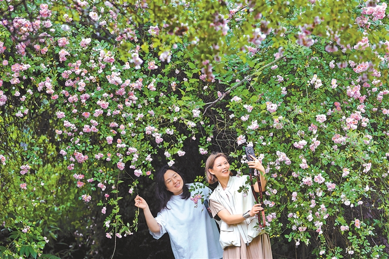 4月27日,游客在重庆市黔江区阿蓬江国家湿地公园花卉园赏花、游玩。新华社发(杨敏 摄)