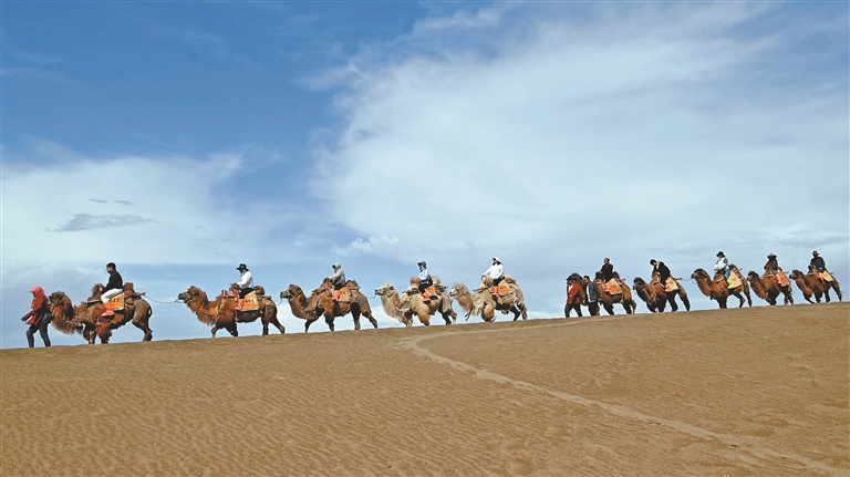 4月27日,游客在甘肃省敦煌市鸣沙山月牙泉景区游览。新华社发(张晓亮 摄)