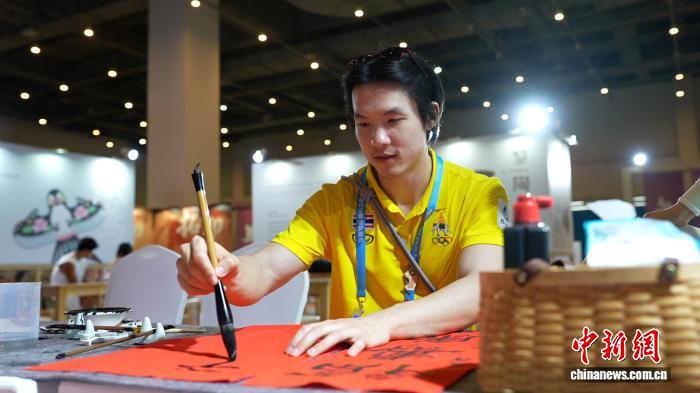 泰国代表团随队医生素帕塔(SUPATAT)体验中国书法。 陈英清 摄