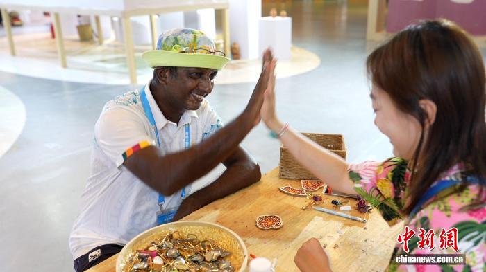 外籍运动员在体验黎锦文创制作后,与工作人员击掌。 陈英清 摄