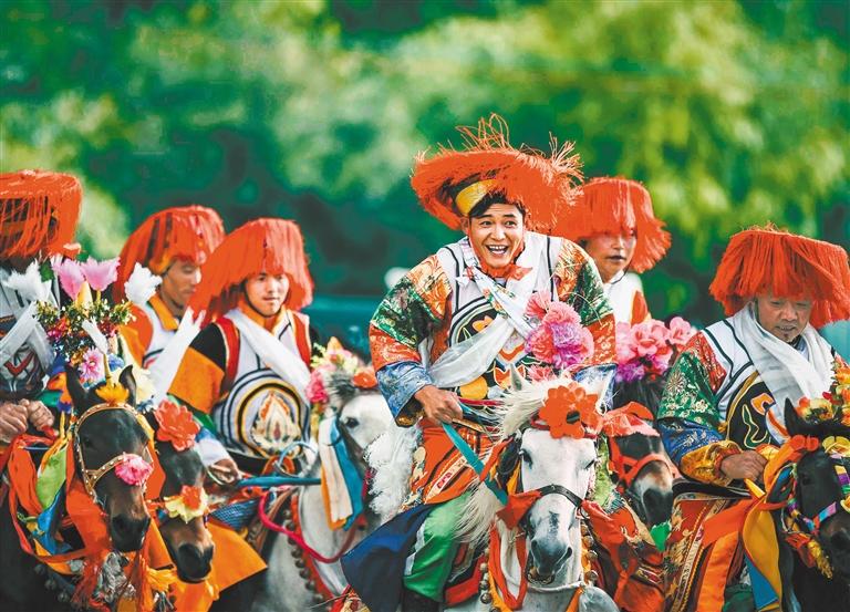 ◀日喀则市桑珠孜区边雄乡岗西村举办望果节赛马活动,农牧民身着盛装,庆祝丰收。王建鹏摄(中经视觉)