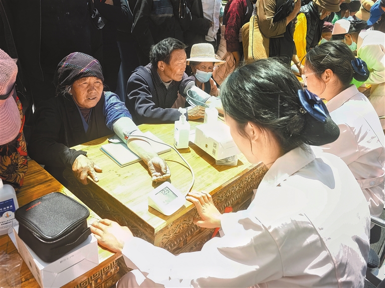 近日,山南市第二中等职业技术学校护理专业师生来到扎囊县阿扎乡章达村,为村民宣讲健康知识、开展健康体检。 图为师生为村民测量血压。记者 武沛涛 摄