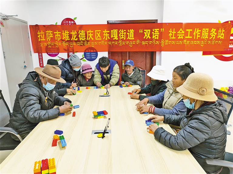 近日,拉萨市堆龙德庆区东嘎街道“双语”社工站为辖区老人开展“趣味乐高 畅享晚年”系列活动。
