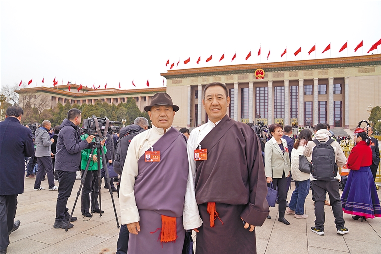 图为住藏全国政协委员尼玛琼拉(左)、勉冲·罗布斯达(右)在人民大会堂前合影。