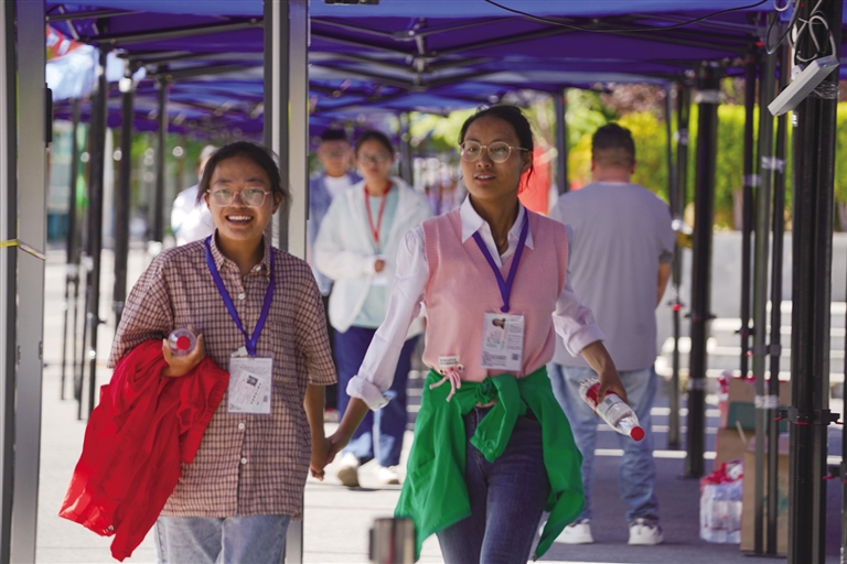 击掌、拥抱……拉萨中学考点附近处处是为考生们加油的老师、家长。有些家长身着旗袍,有的老师手拿向日葵……给孩子加油打气。