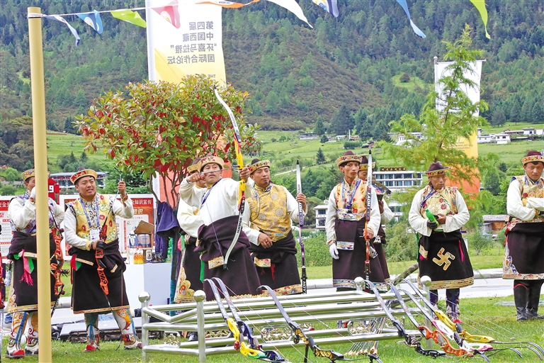 图为“环喜论坛”的非遗体验区工作人员展示工布响箭。记者 谢筱纯 王珊 摄