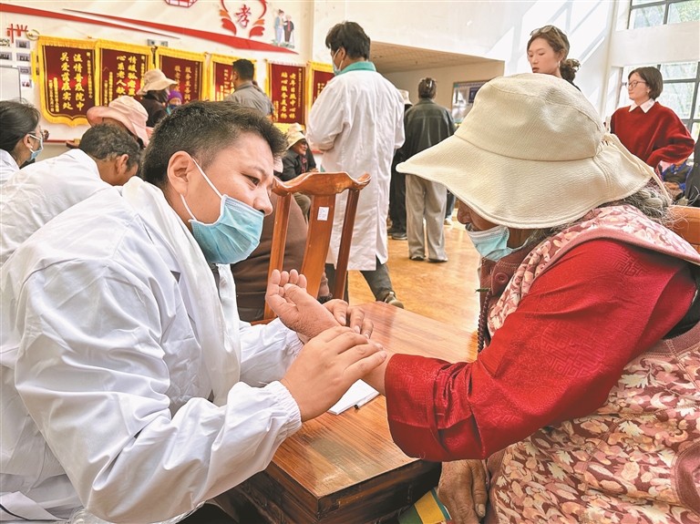 图为活动现场,医生正在为老人把脉问诊。记者 拉巴桑姆 摄
