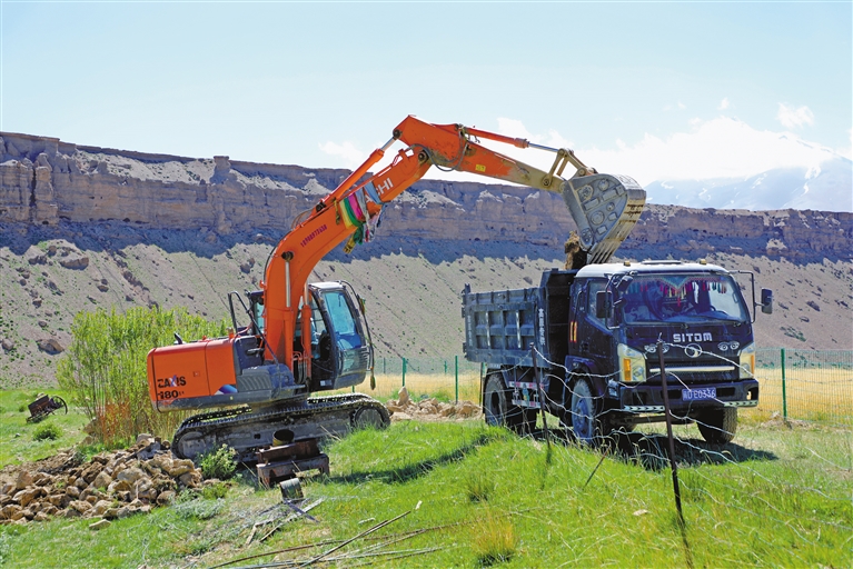 普兰县普兰镇仁贡村孔雀施工队的机械车辆在施工,当地群众在普兰县普兰镇施工队务工,一天可增收230元。记者 温凯 摄