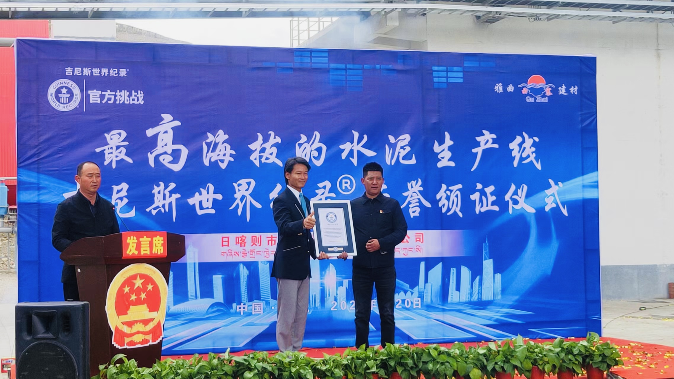 当天,经过对雅曲新型建材有限公司熟料水泥生产线相关信息及数据的严格评估和审核,吉尼斯世界纪录咨询(北京)有限公司认证官杨绍鹏现场宣布,由挑战者日喀则市雅曲新型建材有限公司发起挑战的“最高海拔的水泥生产线 Highest altitude cement production line”吉尼斯世界纪录称号,最终以海拔高度4251.951⽶,打破了挑战目标,成为新的吉尼斯世界纪录保持者!