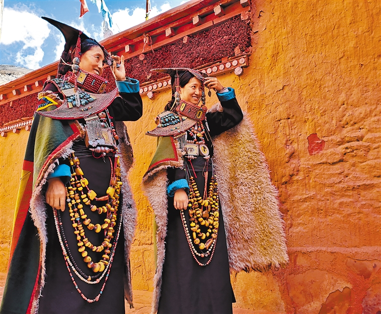 普兰县科迦村位于边境,独特的地理环境孕育了独特又多彩的传统文化。巴桑仓决说:“我们村向来是女性当家,‘飞天服’只传女不传男。这套服饰在我家已经传承了十几代,17岁那年,当我第一次穿上它的时候,才了解到世代相传的重要意义。母亲曾说,这是科迦的珍宝,保护好它就是在保护我们生命的记忆。”