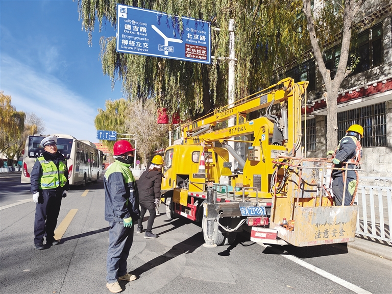 园林工人修剪遮挡路灯、监控探头的枝叶。图由拉萨城关区洁达园林绿化投资工程有限公司提供