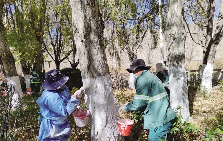 园林工人为树木涂白防蛀虫。 图由拉萨城关区洁达园林绿化投资工程有限公司提供