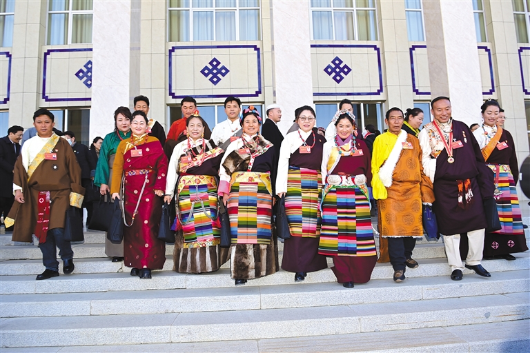 代表们在西藏人民会堂前合影留念。记者 王敏 摄