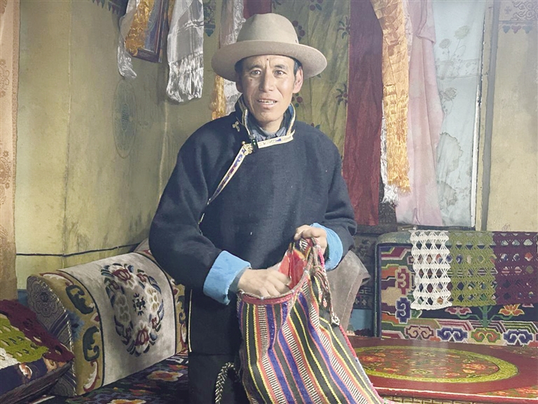 放牧巡边途中的经历,格桑觉得只是日常的事情,并没有什么值得讲述的。不过,他也有特别珍视的东西。格桑特意走进另一间屋子,捧出一个略显旧色的布袋。他小心打开袋子,里面是他珍藏的一面面国旗。