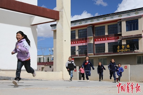 9月14日,西藏那曲市班戈县第二(中石化)小学,学生们课间休息时在户外玩耍。中青报·中青网记者 孔斯琪/摄