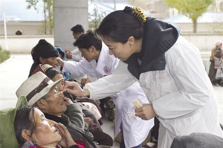 1990年,自治区藏医院将眼科从外科中独立出来,并派遣次旦央吉赴自治区人民医院眼科进修,学习现代医学基础和眼科学知识。1991年,次旦央吉顺利完成自治区藏医院首例白内障冷冻摘除手术,奠定了医院眼科发展的基础。从此,次旦央吉为患者服务的脚步再也没有停下来,从西藏昌都到青海玉树、从林芝到那曲,她为无数患者带去了光明。巡诊中,次旦央吉发现相较于拉萨,部分偏远地区的眼科诊疗技术相对薄弱,于是她将返聘后的工作重点放在了基层眼科医生的培养上,“我下乡巡诊过很多地方,发现有的县级医院只设有五官科,没有独立的眼科,这使得当地群众患上一些严重眼部疾病时,只能去较远的大医院进行治疗,费时费力还容易耽误病情,因此培养基层眼科医疗人才很有必要,我也愿意把自己的技术教授给他们,造福更多的患者。”次旦央吉说。