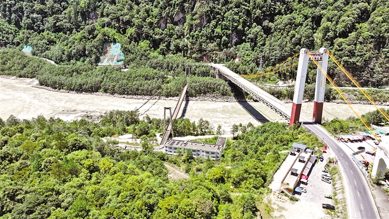 汹涌奔腾的易贡藏布江上,高山密林的峡谷间,一座木板吊桥、一座钢架悬索桥、一座新修的特大桥,呈阶梯状横架于江上。这三座桥是国道318线上一道独特的风景。川藏线联合报道组经过通麦小镇,探访这背后的历史。
