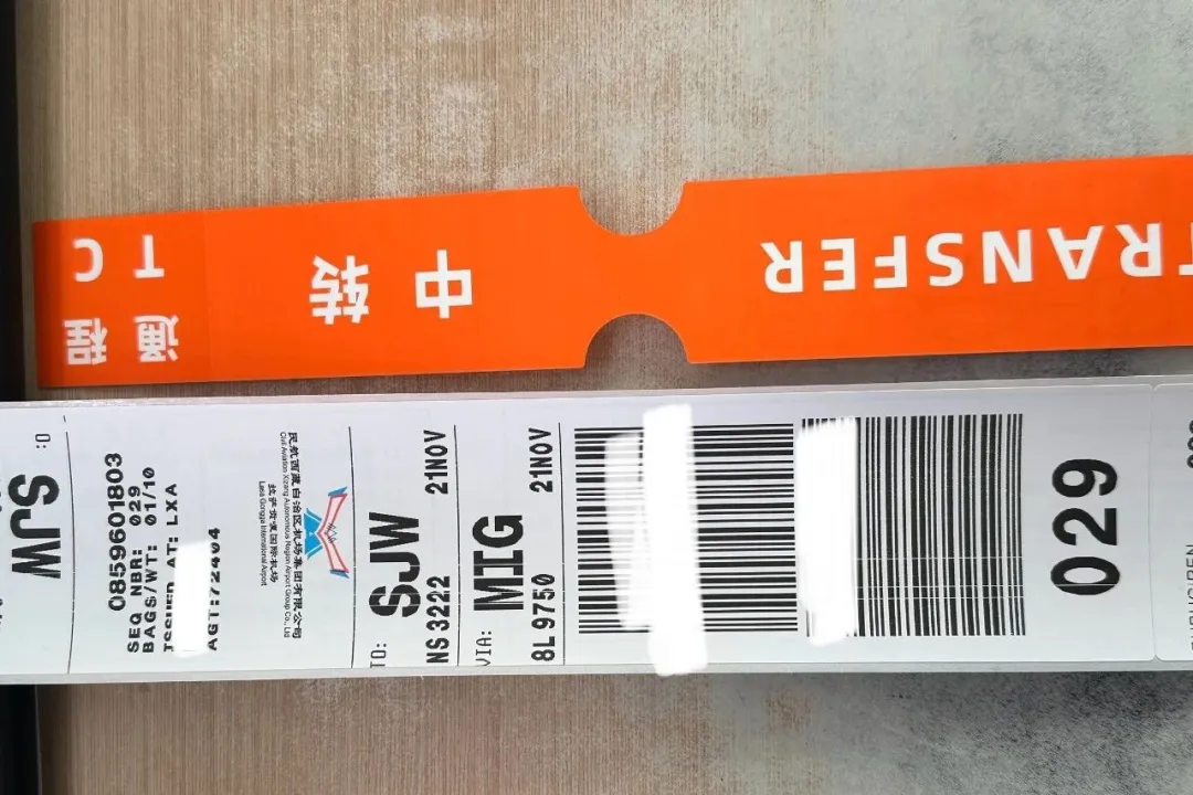 图为绵阳中转的跨航司中转行李条样式。
