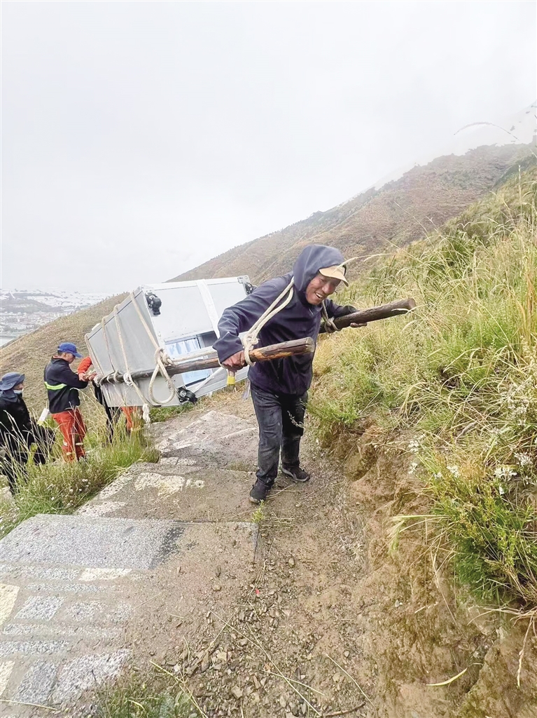 为了方便游客喝到平价饮料,单位引进了12台售卖机,安装在公园各个角落,售卖机里各种饮料、矿泉水等商品跟超市售卖的价格基本一致。扎西曲培说,他们将售卖机安装在海拔4000米的地方,过程是艰难的。一台售卖机重约400斤,车辆上不去,他和森林消防队员通过人背肩扛,一步步抬上去的。目前,在南山公园“祖国万岁”的山峰处,大家口渴了,拿出手机扫描一下,即可喝到平价的矿泉水。