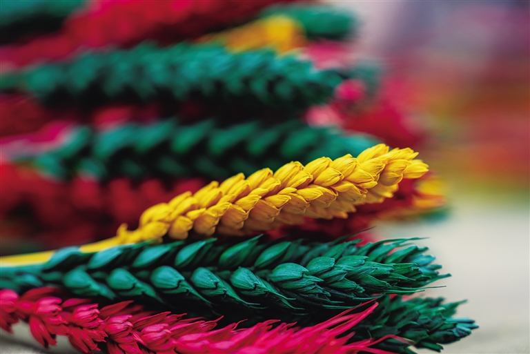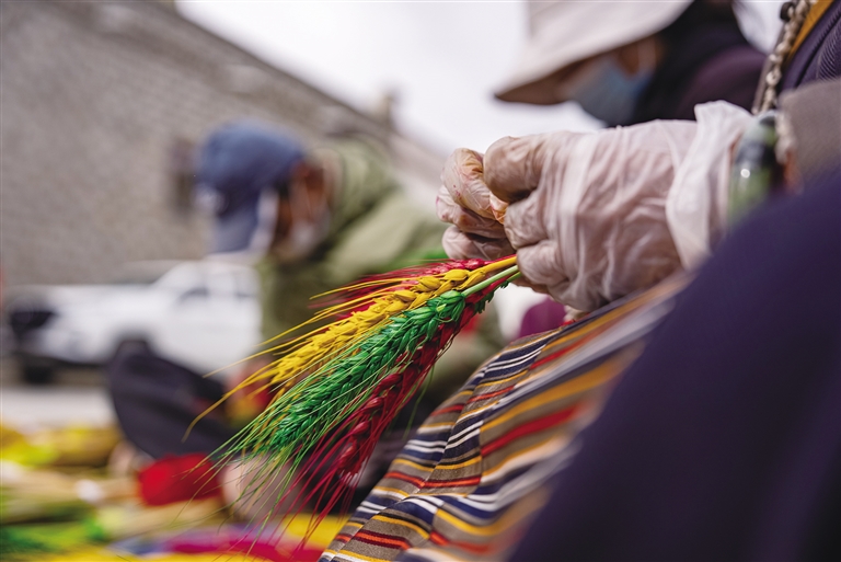 从春耕、夏耘、秋收到冬天的染色、晾干、捆绑、售卖,“罗萨梅朵”的制作过程并不简单,种植和上色都极其辛苦。卓玛次仁告诉记者:“每年4月,我们开始种植小麦和青稞,浇水施肥。9月收割时,我们会挑选颗粒饱满的麦穗和青稞穗,捆绑后去皮晒干。10月,将它们收入屋中,一层层垒起来,房间最好朝阳且没有老鼠。11月,开始采购颜料和捆扎用的毛线。”