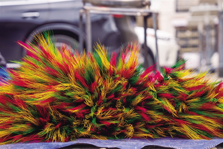 “销量好的时候一天可以卖近1000元,一般的时候也有500元左右。”央金仔细检查着刚染好色的“罗萨梅朵”,她的手和脸因长时间接触颜料而沾满色彩。“以前‘罗萨梅朵’的颜色并不多,只有玫红色,上色不均匀也没人会说什么。但现在,颜色必须亮丽、均匀,这也体现了大家生活越来越好,生活品质越来越高。”央金笑着说。