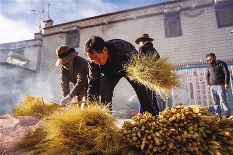 每年12月起,桑木村处处可见“罗萨梅朵”。清晨,天还未亮,村民们就已忙碌起来。有人将制作好的“罗萨梅朵”打包送往拉萨市区售卖,有人则继续为剩下的麦穗和青稞穗上色、晒干。“我从小看着长辈们制作‘罗萨梅朵’,7岁就开始帮忙捆绑,20岁开始独立制作。每到这个时候,我就知道新年快到了。”64岁的村民卓玛次仁回忆道。
