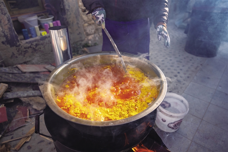 “玫红色和黄色的都做完了吧?这个颜料水我倒了,开始准备制作青色。”一旁,61岁的央金将盆洗干净,继续煮水放入颜料。“‘罗萨梅朵’有青色、绿色、玫红色、黄色四种颜色,其中青色耗时最长,不仅需要自己调制,而且最难上色。”央金说,“我们一般是早上7点开始上色,上完色都快下午4点了。”