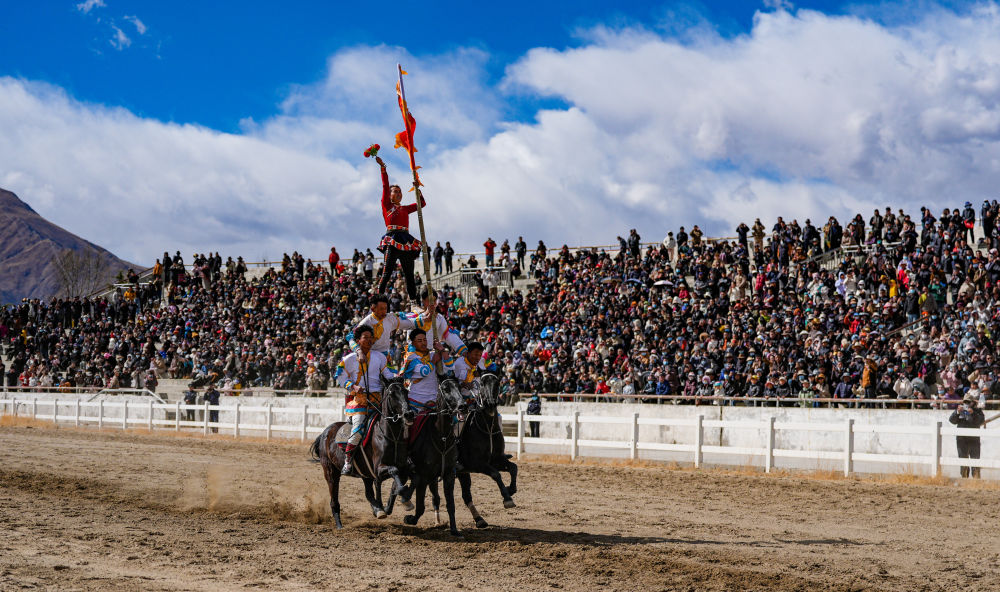 当日,2025年藏历新年初三民族传统马术表演暨民族赛马活动在拉萨市北郊赛马场举行。马术在西藏是吉祥、勇敢和智慧的象征。骑手们用精彩表演为观众送上新年的祝福。