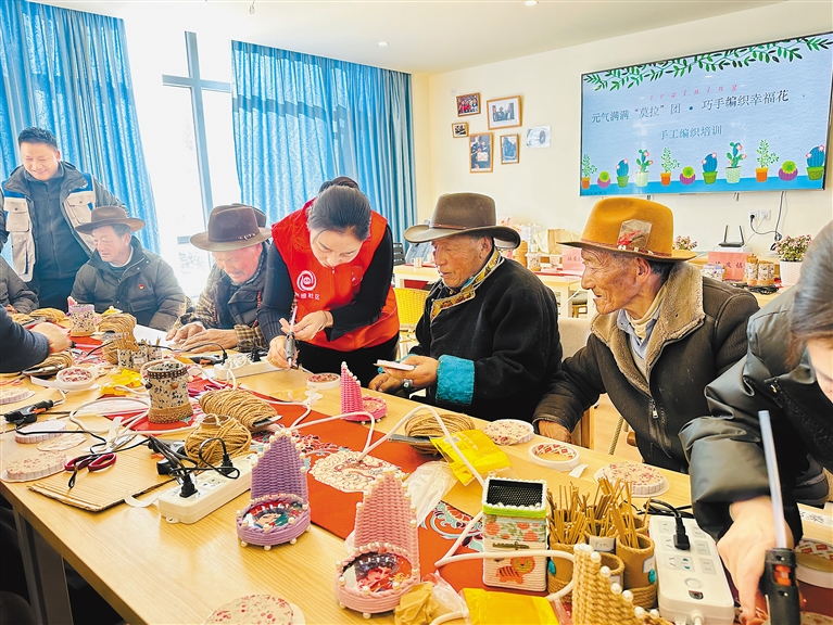图为堆龙德庆区德庆镇老幼日间照料中心社工与老人共同制作手工艺品。通讯员 白玛央金 摄
