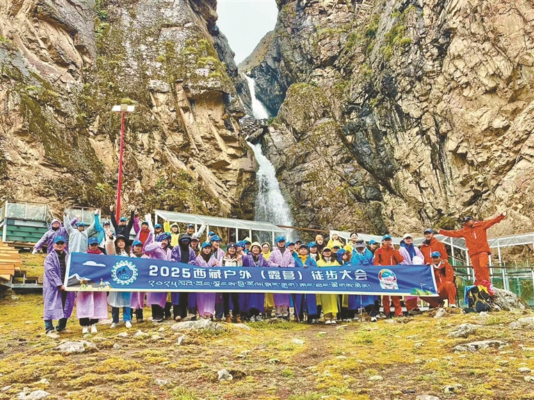 图为参加西藏户外(露营)徒步大会的户外徒步爱好者在曲加瀑布前合影。本报记者 欧珠次仁 摄