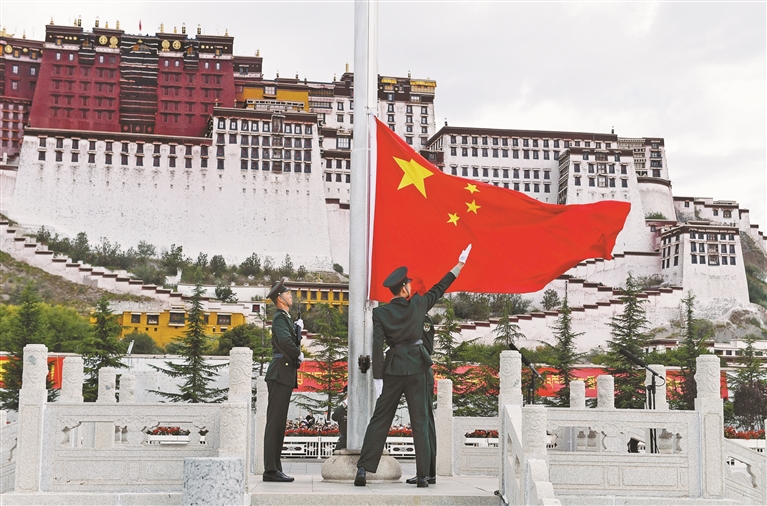 金秋十月举国同庆,神州大地繁花似锦。10月1日上午,自治区庆祝中华人民共和国成立76周年“升国旗、唱国歌”仪式在布达拉宫广场举行。图为仪式现场。记者 旦增兰泽 摄