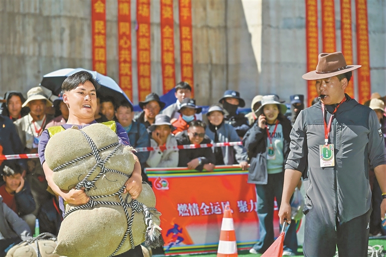 选手在参加抱沙袋比赛。记者 贡秋曲措 摄