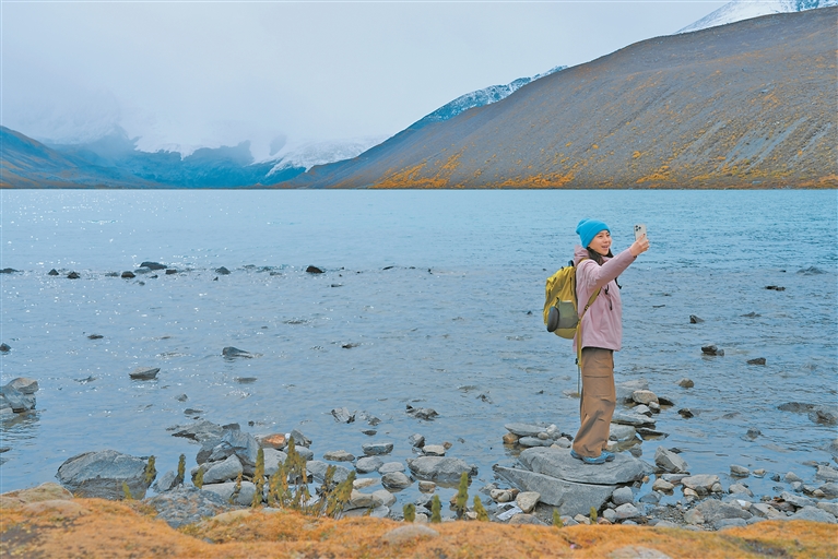 图为游客在萨普景区自拍留念。记者 万靖 摄