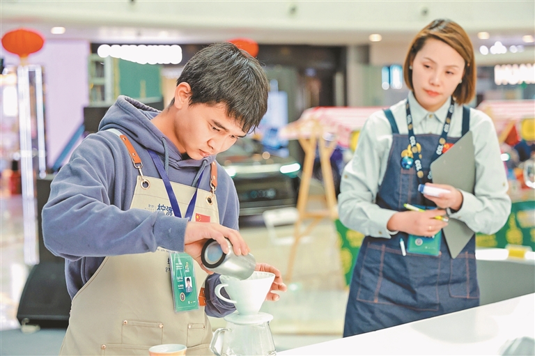图为比赛选手在进行咖啡冲煮。记者 格桑伦珠 摄