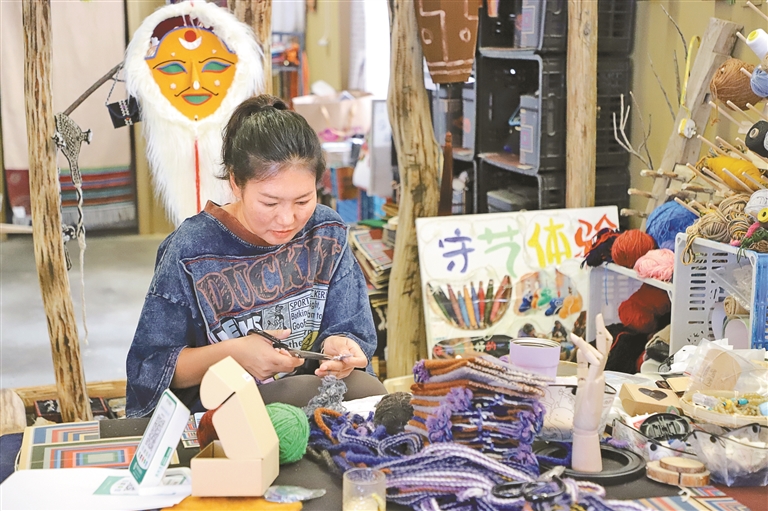 店铺里的小动物文创,个个憨态可掬、毛绒绒、圆滚滚很是讨人喜欢;五彩织绳牵着一颗用羊毛缠绕的湛蓝色的心,伸手一碰,软乎乎的,轻轻按压时,还会像心跳般微微起伏……各式各样的文创包包更是让人挪不开眼。