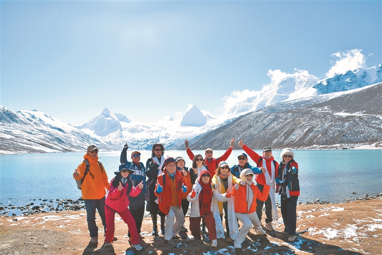 图为电影主创人员与比如县萨普旅游景区游客合影。记者 汪纯 摄