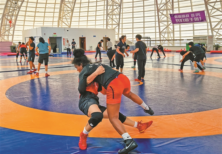 在摔跤场馆,运动员进行摔跤训练。记者 洛桑 摄