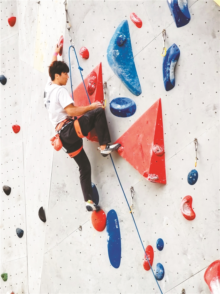 在攀岩场馆,攀岩运动员正在训练中。记者 洛桑 摄