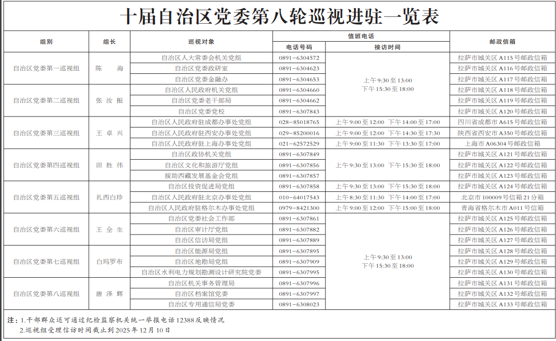 本网拉萨10月25日讯(记者 赵文慧 见习记者 土旦仁青)根据自治区党委关于巡视工作的统一部署,截至10月24日,十届自治区党委第八轮巡视完成进驻工作。自治区党委巡视组将对自治区人大常委会机关、政府机关、政协机关,自治区党委社会工作部、政研室、金融办、老干部局、机关事务管理局、党校,自治区审计厅、信访局、能源局、投资促进局、地勘局、档案馆、专用通信局、水利电力规划勘测设计研究院,自治区人民政府驻北京办事处、驻成都办事处、驻西安办事处、驻上海办事处、驻格尔木办事处,援助西藏发展基金会等23个区直单位党组织开展常规巡视;对自治区文化和旅游厅党组开展巡视“回头看”。