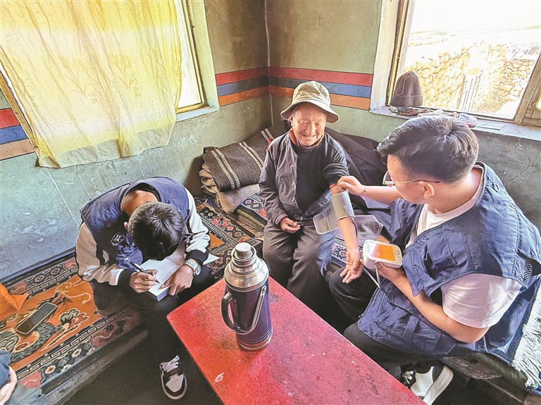 图为当雄县羊八井镇民政服务站工作人员入户为特供分散户老人做基础生命体征检查。