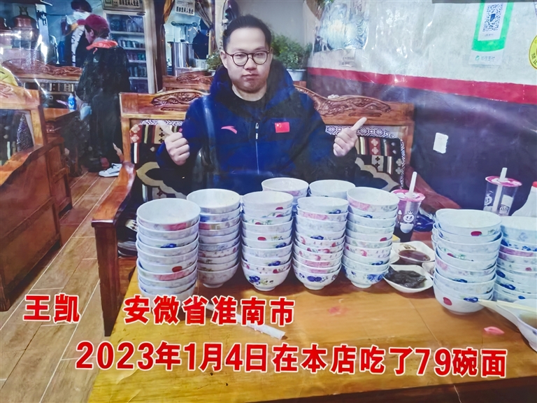 于是,“加加面挑战”,成了餐馆里最热闹的环节。普布夫妻俩定下规矩:谁能打破吃加加面的纪录,就送5斤芒康红酒。2023年1月4日,来自安徽省淮南市的汉族小伙王凯,一口气吃了79碗,是店里的“纪录保持者”,至今无人打破。普布笑着说,这个挑战不是噱头,是盐井加加面的传统,就是想让大家热闹热闹,感受一下康巴人的豪爽。