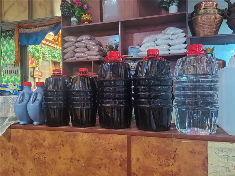 除了加加面,新餐馆里还多了两样“新东西”:芒康的红酒和盐井的盐巴。“老家的红酒是用高原葡萄酿的,盐巴是千年古盐田产的,都是好东西。”普布说,他每次回芒康,都会帮亲戚朋友把红酒和盐巴运到拉萨,放在餐馆里卖。这样不但能帮亲戚朋友增加点收入,也能顺便推广老家的特产。