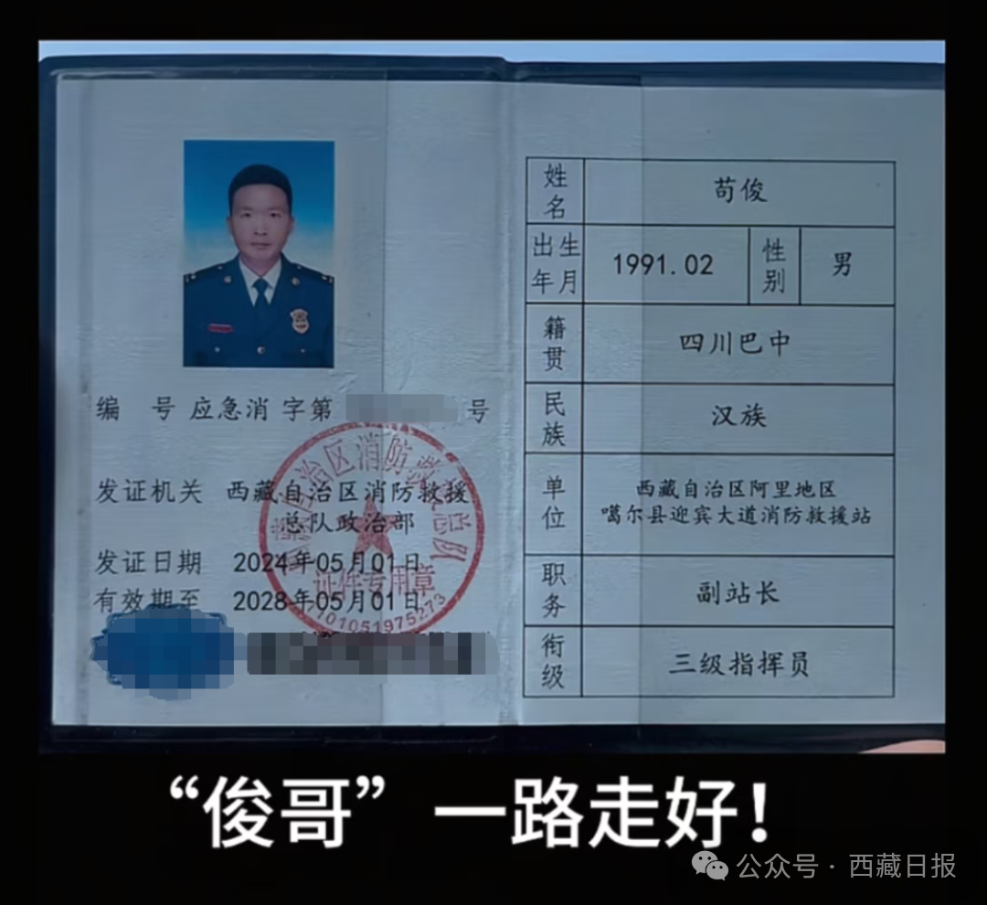 苟俊是西藏自治区阿里地区噶尔县迎宾大道消防救援站副站长,衔级为三级指挥员。此次事发时,他正处于休假探亲期间。