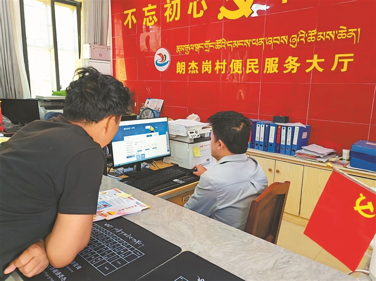 图为墨脱县朗杰岗村便民服务大厅工作人员在为群众办理宅基地分割登记审批。通讯员 牛佳琼 摄