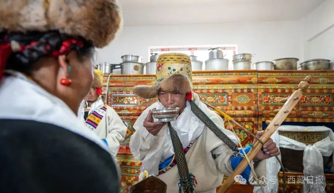 央金手捧银碗,斟满青稞酒,向客人敬上“三口一杯”。不一会儿,歌声悠然响起,人们自然而然地围成一圈,伴着扎念琴,跳起定日洛谐。