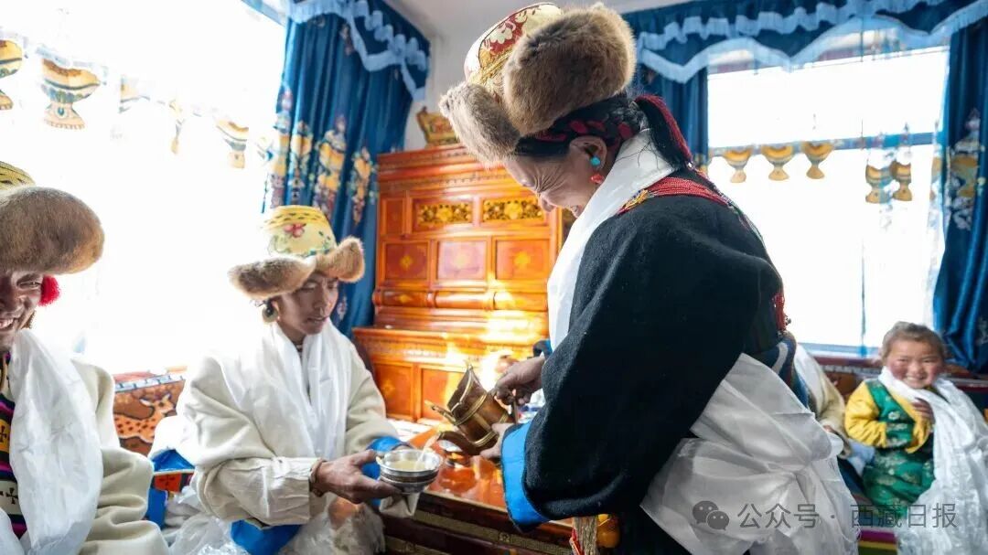 “康索”仪式在村中长辈、村党支部书记多吉带头下开始,他为索朗顿珠全家献上洁白的哈达,并朗声念诵吉祥祝词。